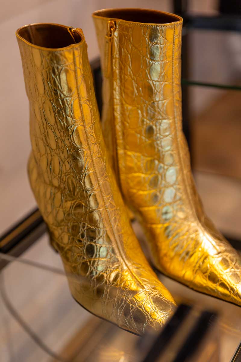 Le détail est au cœur de la création Giuseppe Zanotti. Chaînes dorées, strass délicatement incrustés, jeux de matières contrastées, reflets métalliques subtils : le créateur transforme l’accessoire en œuvre d’art.