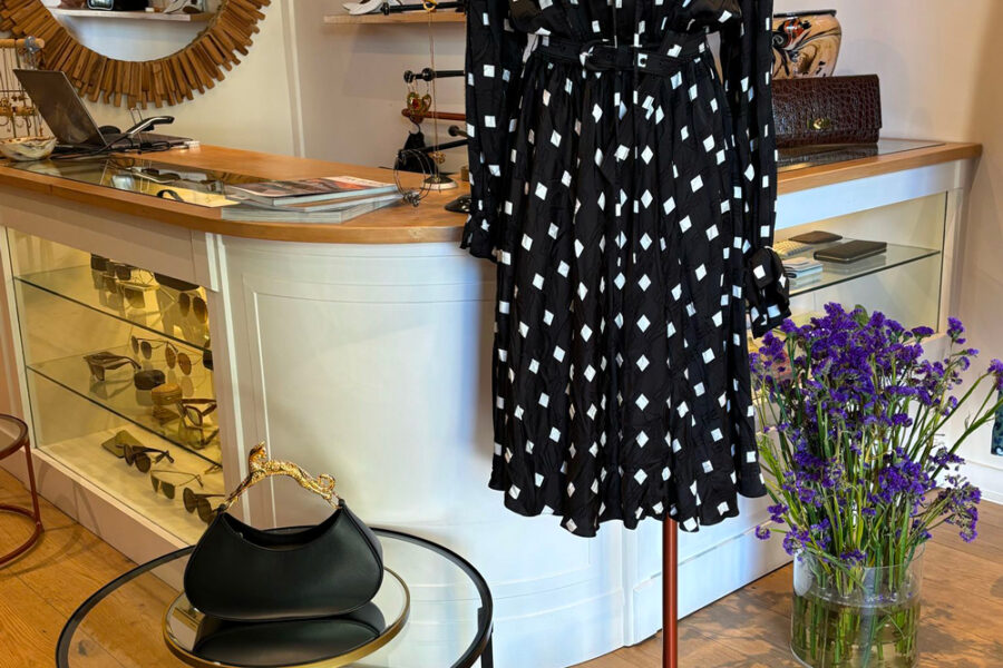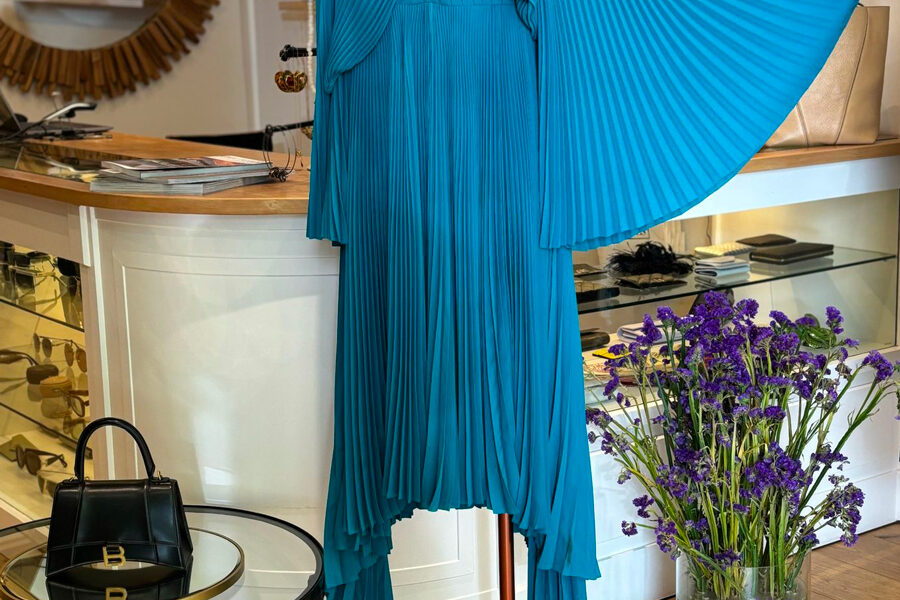 Robe et sac Patou, veste Prune Goldschmidt et chaussures Giuseppe Zanotti